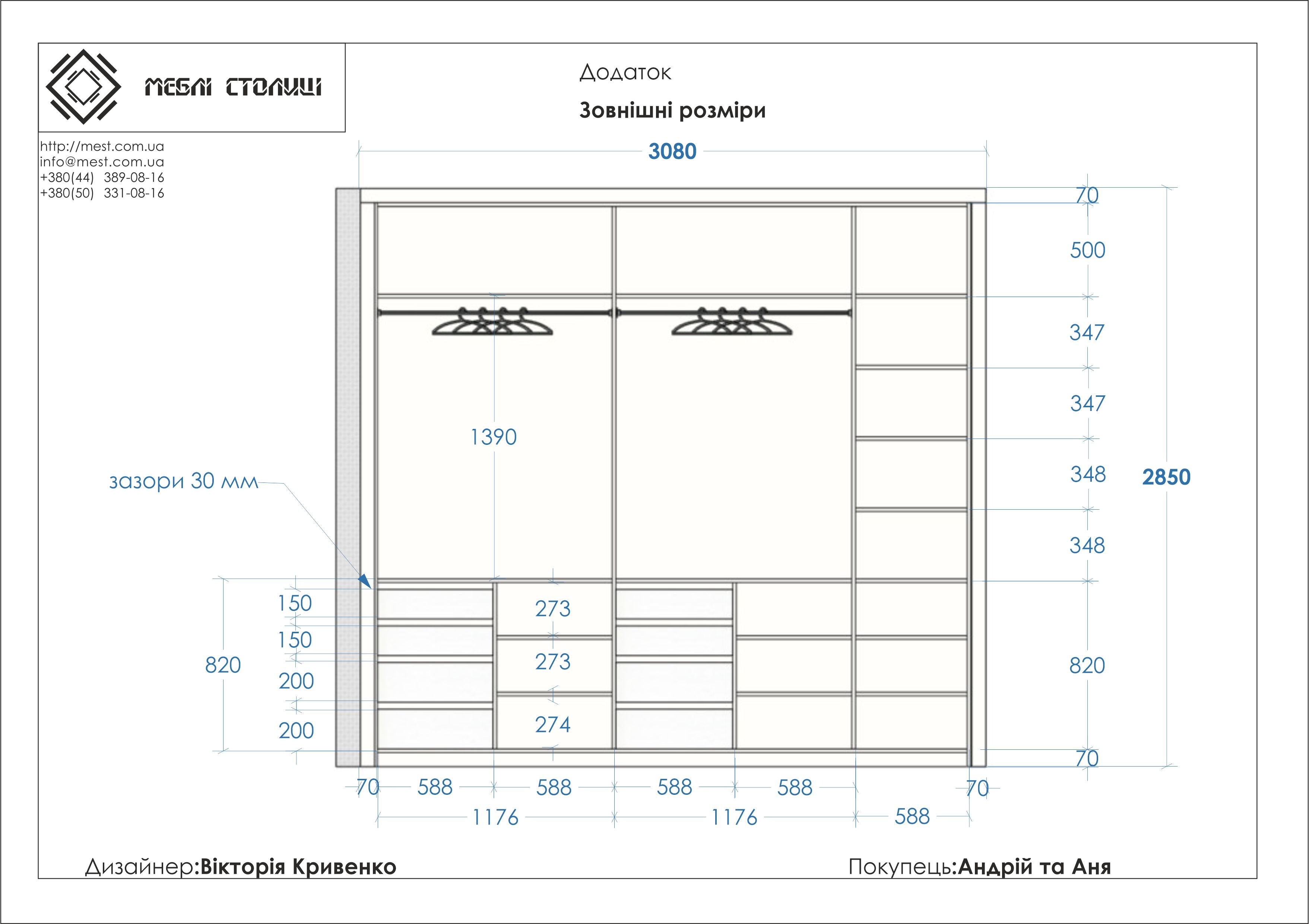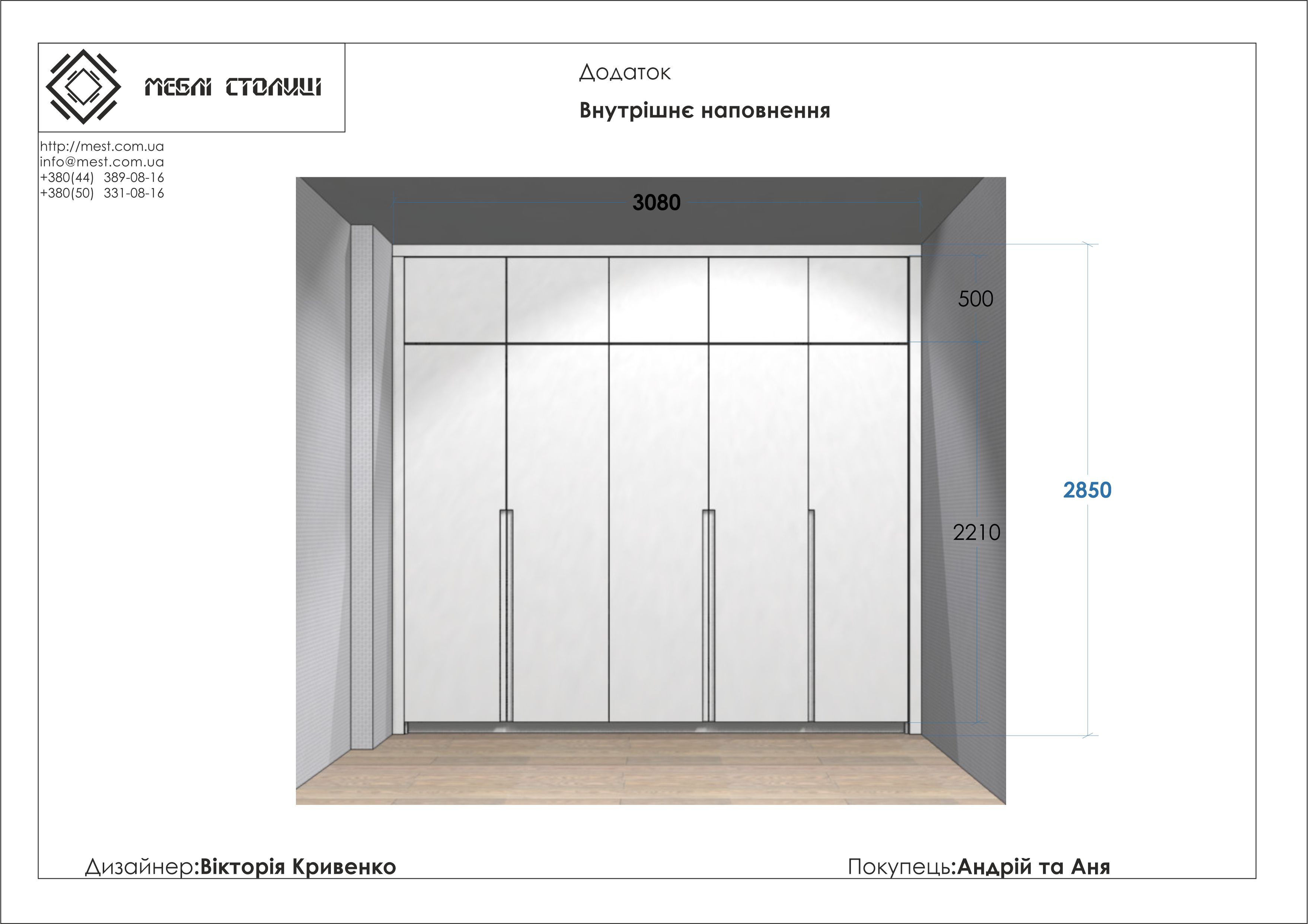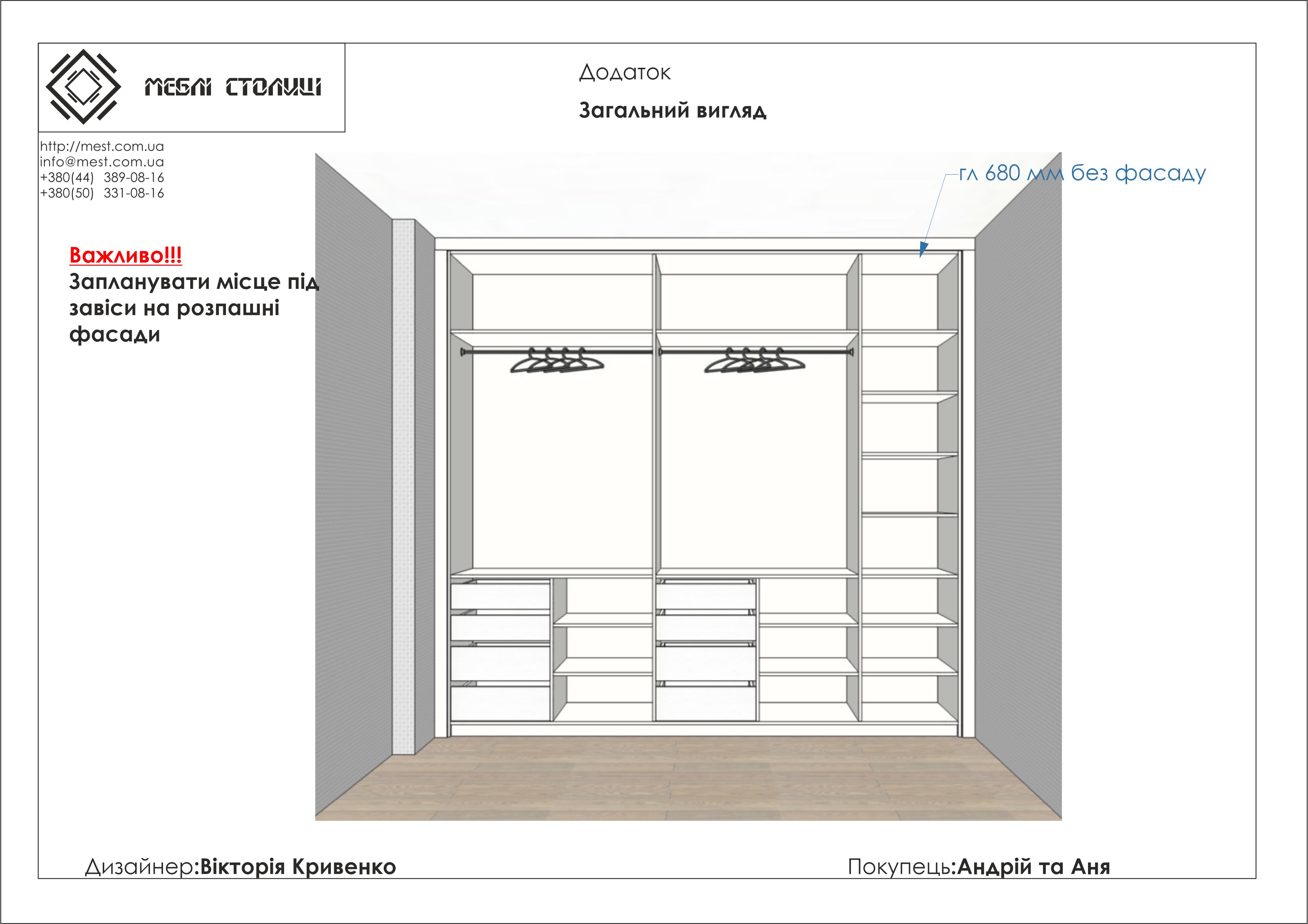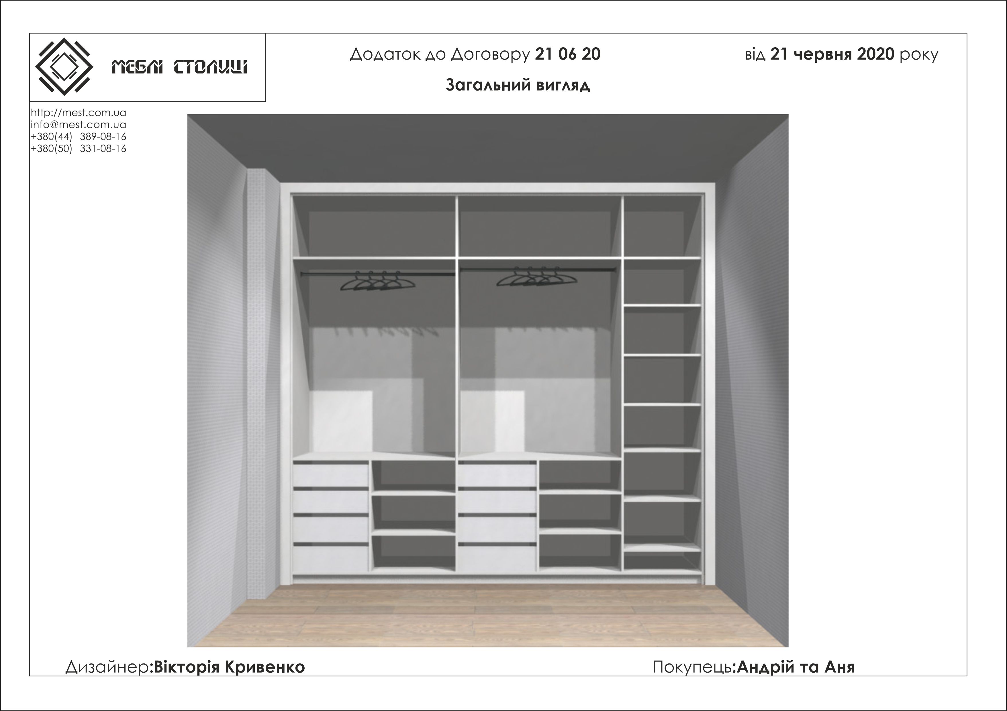 Менеджер: Тел: Номер замовлення: 21 06 20Дата початку: 23/06/2020Дата виконання: 29/07/2020Вартість: 40 000 гривень Категорії: Шафи-купе