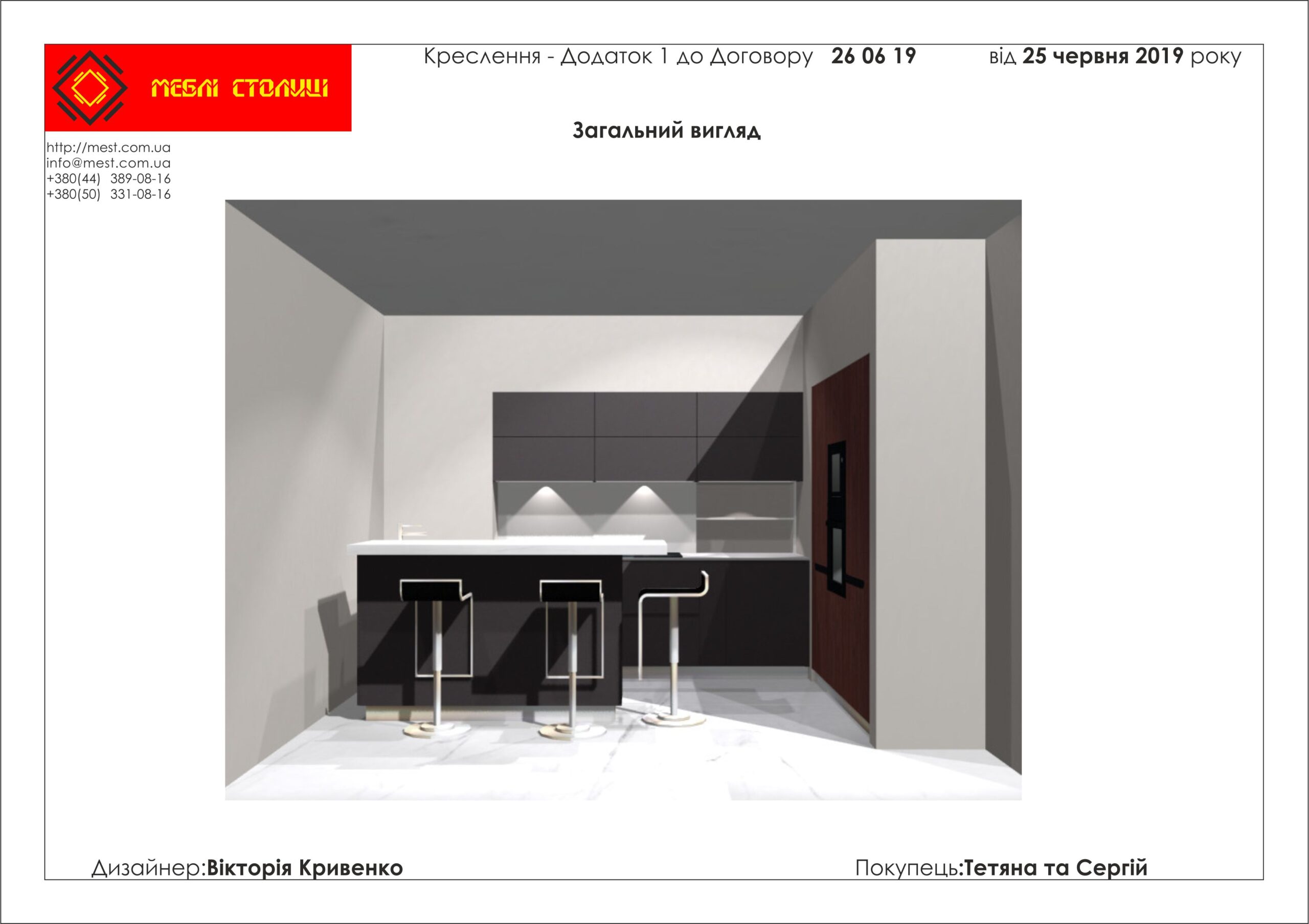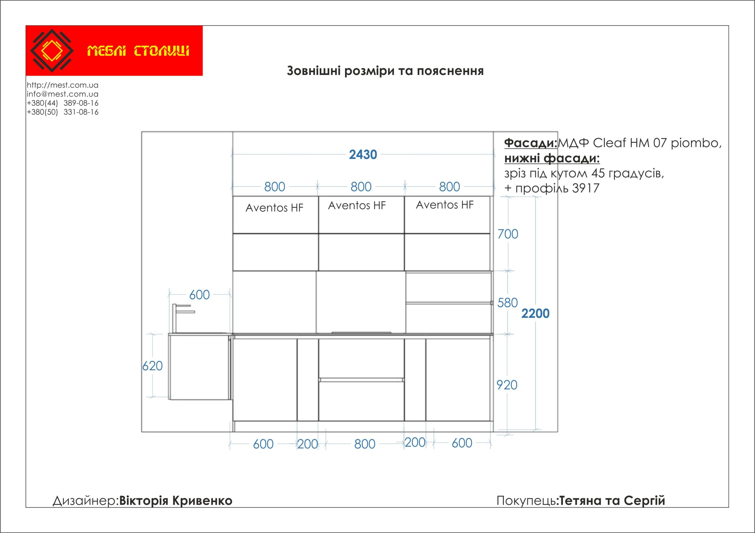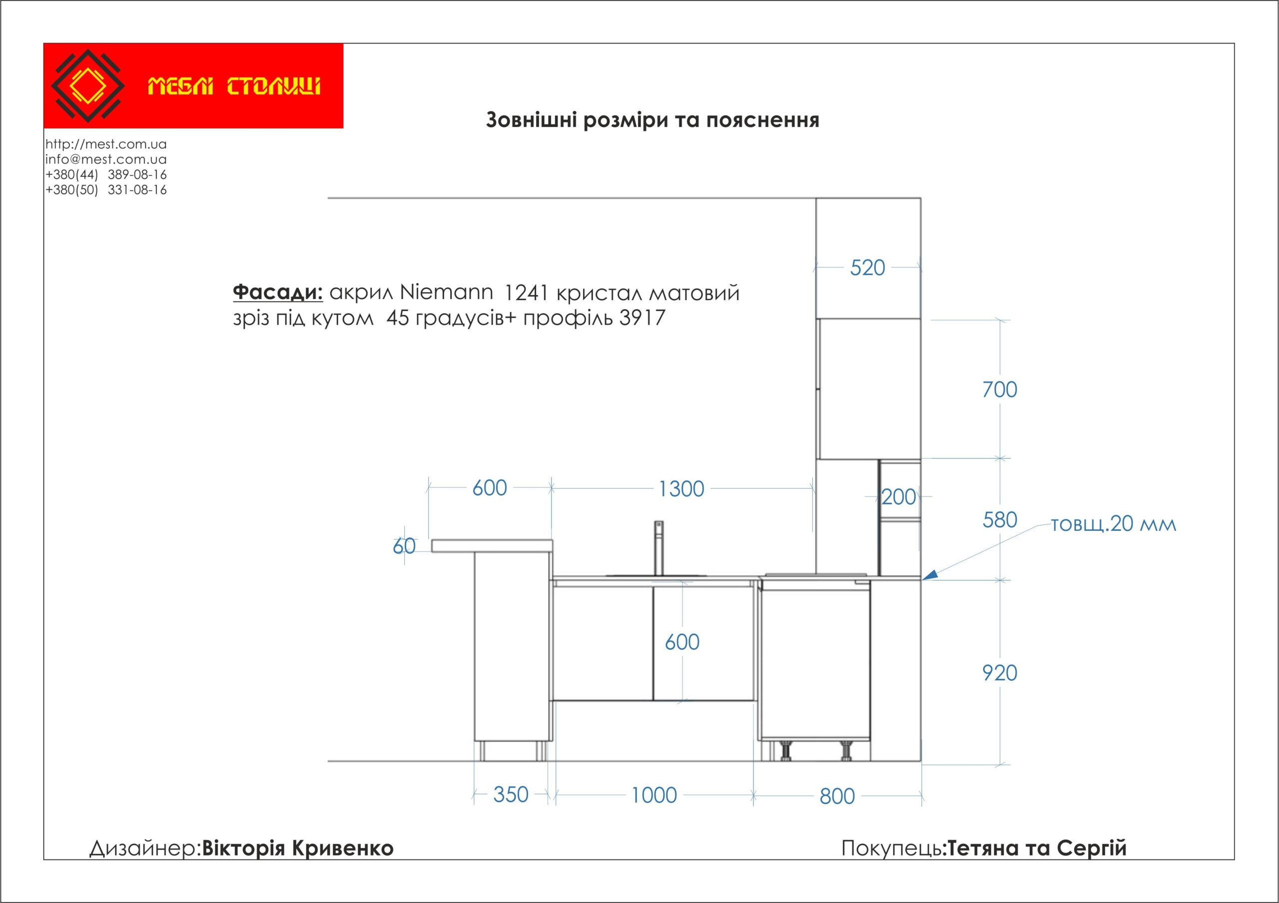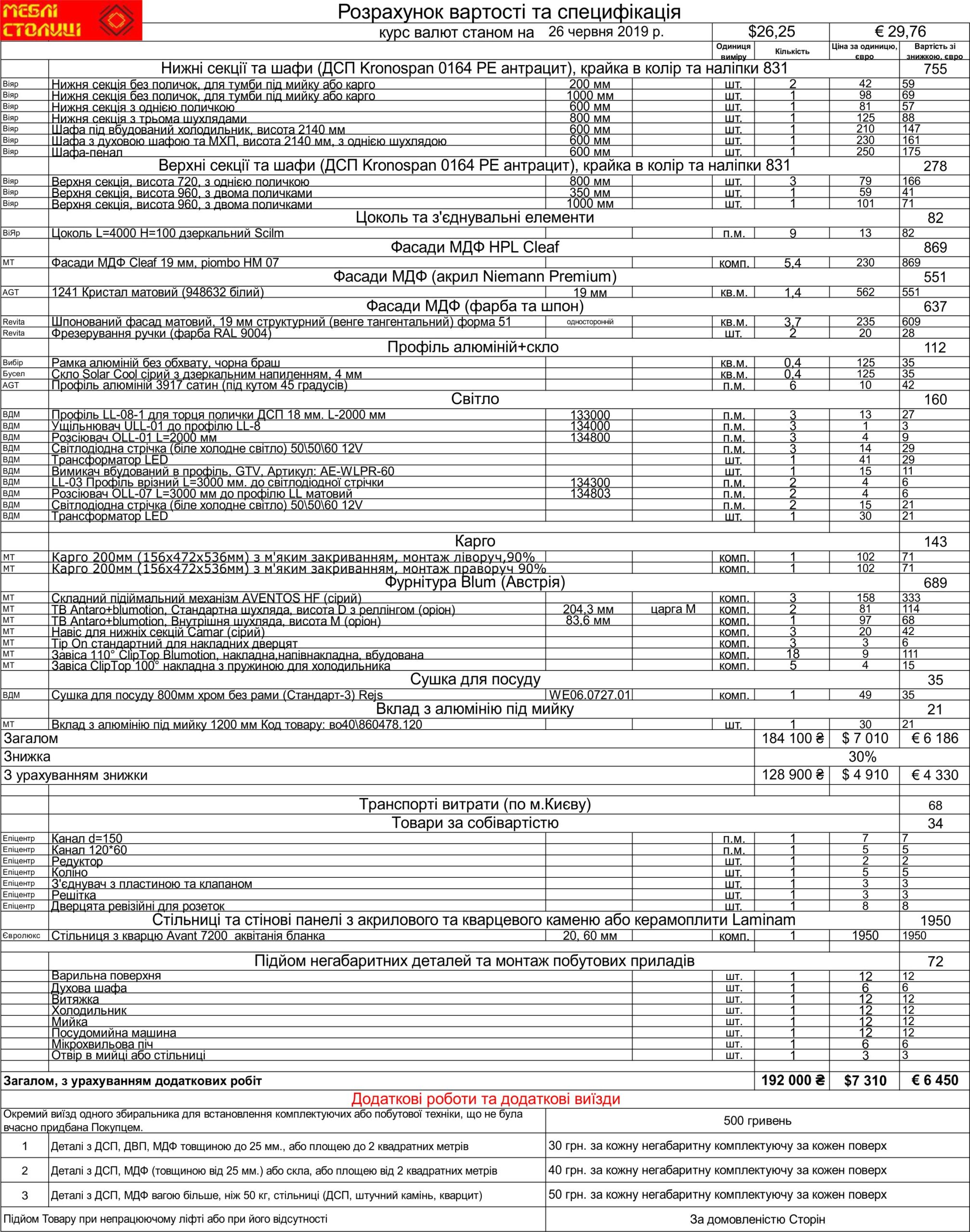 Менеджер: Тел: Номер замовлення: 26 06 19Дата початку: 01/07/2019Дата виконання: 11/08/2019Вартість: 192 000 гривень Категорії: Кухні