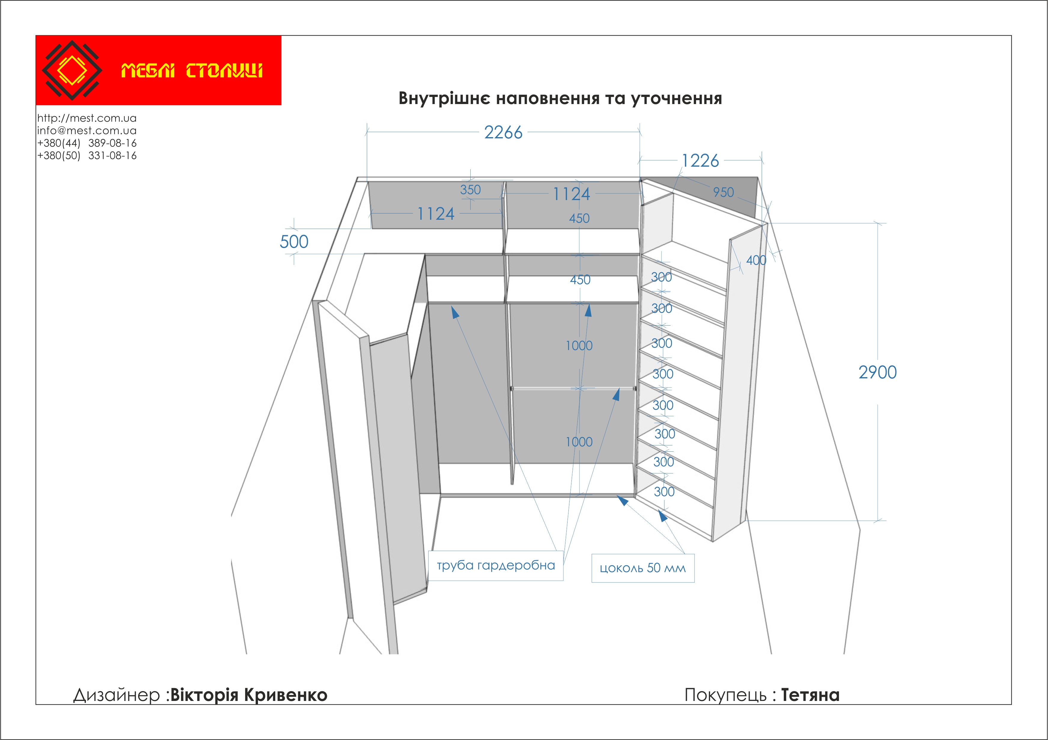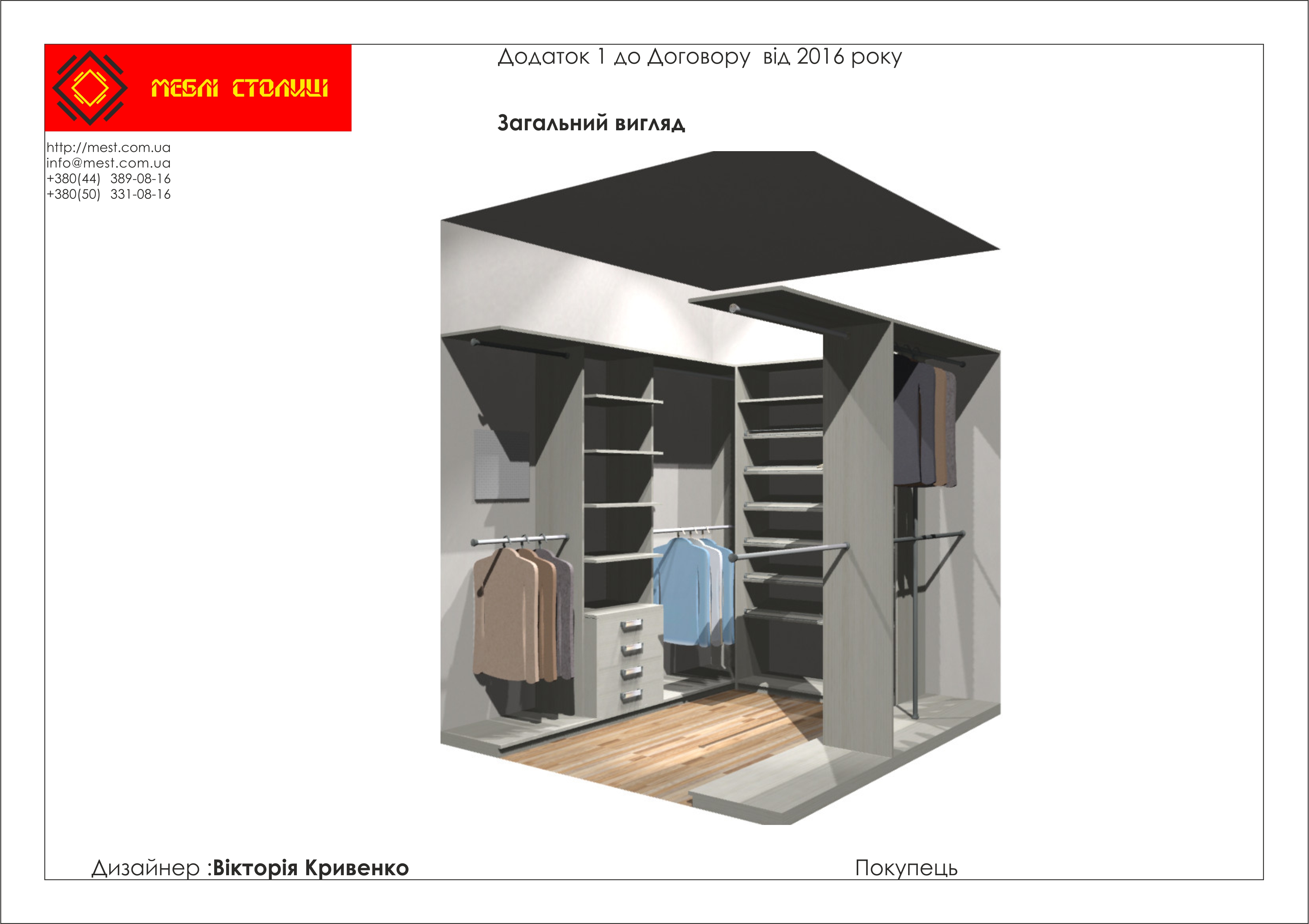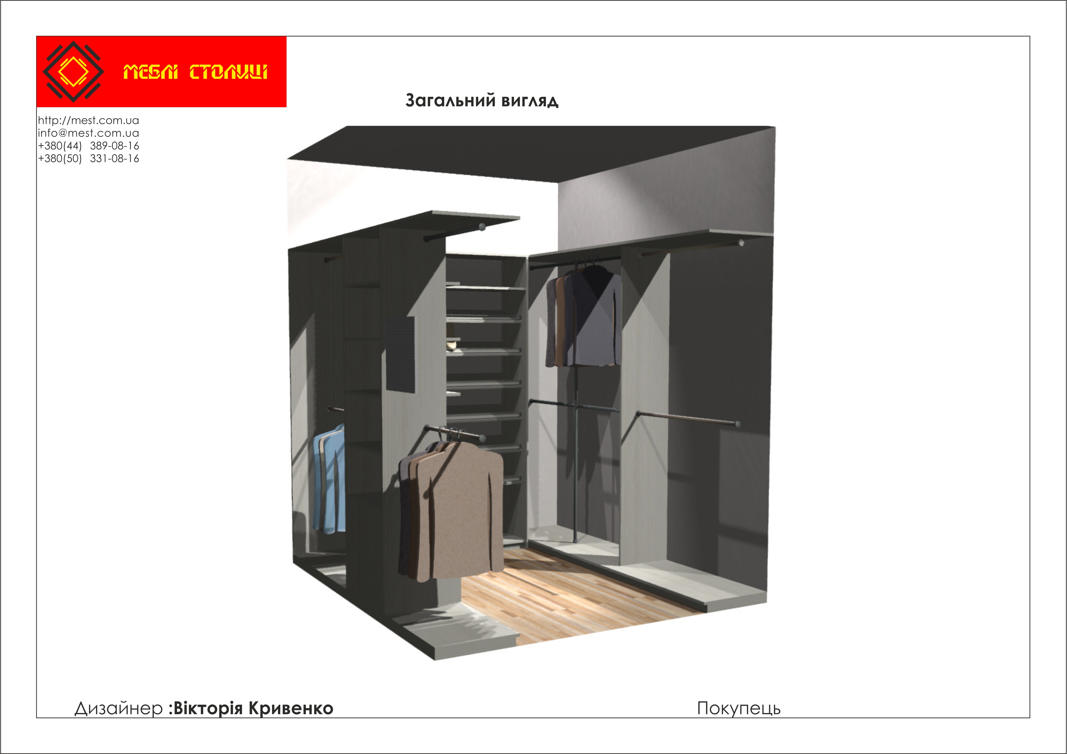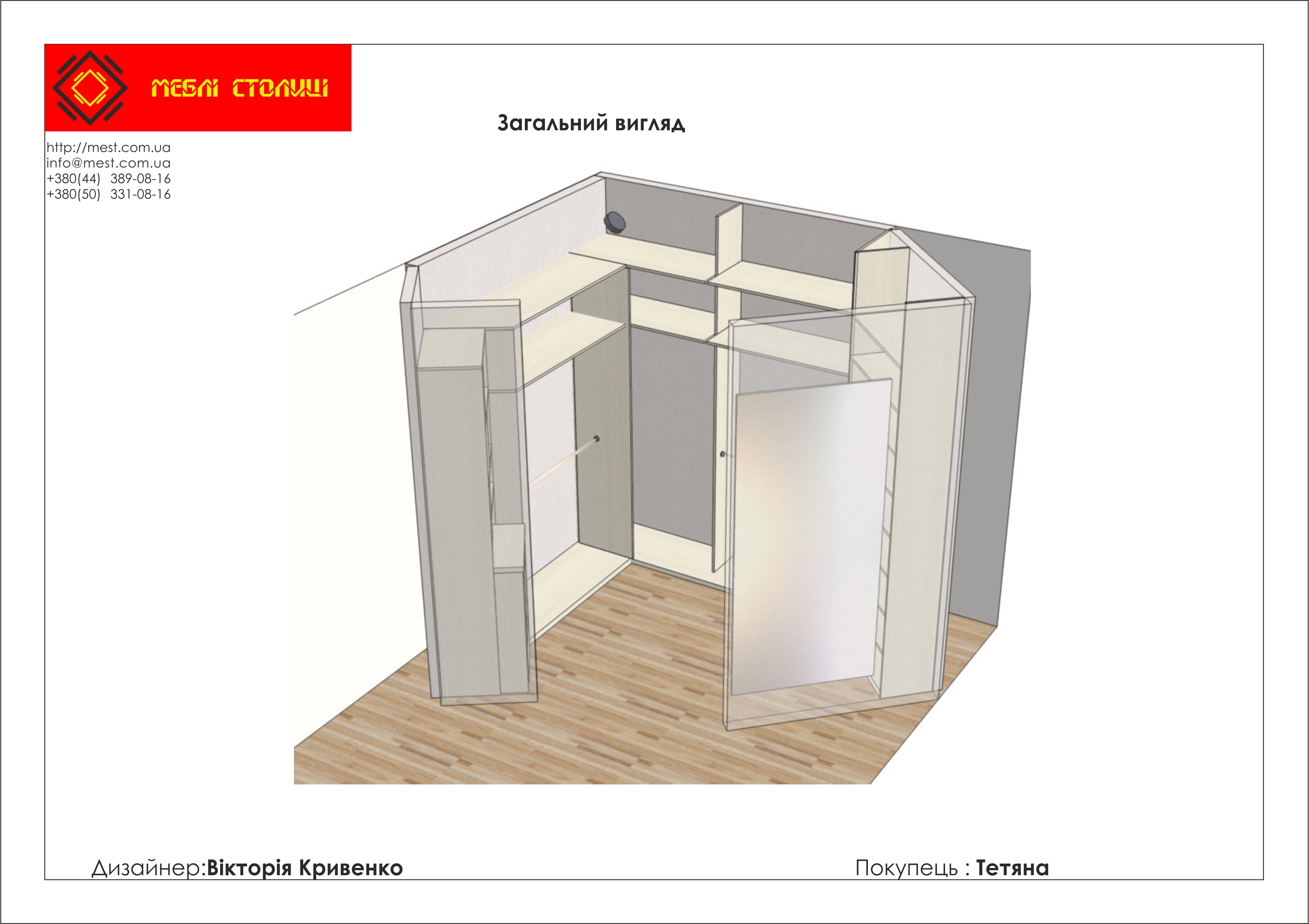 Менеджер: Тел: Номер замовлення: 35 08 16Дата початку: 12/08/2016Дата виконання: 12/10/2016Вартість: 106 300 гривень Категорії: Гардеробні